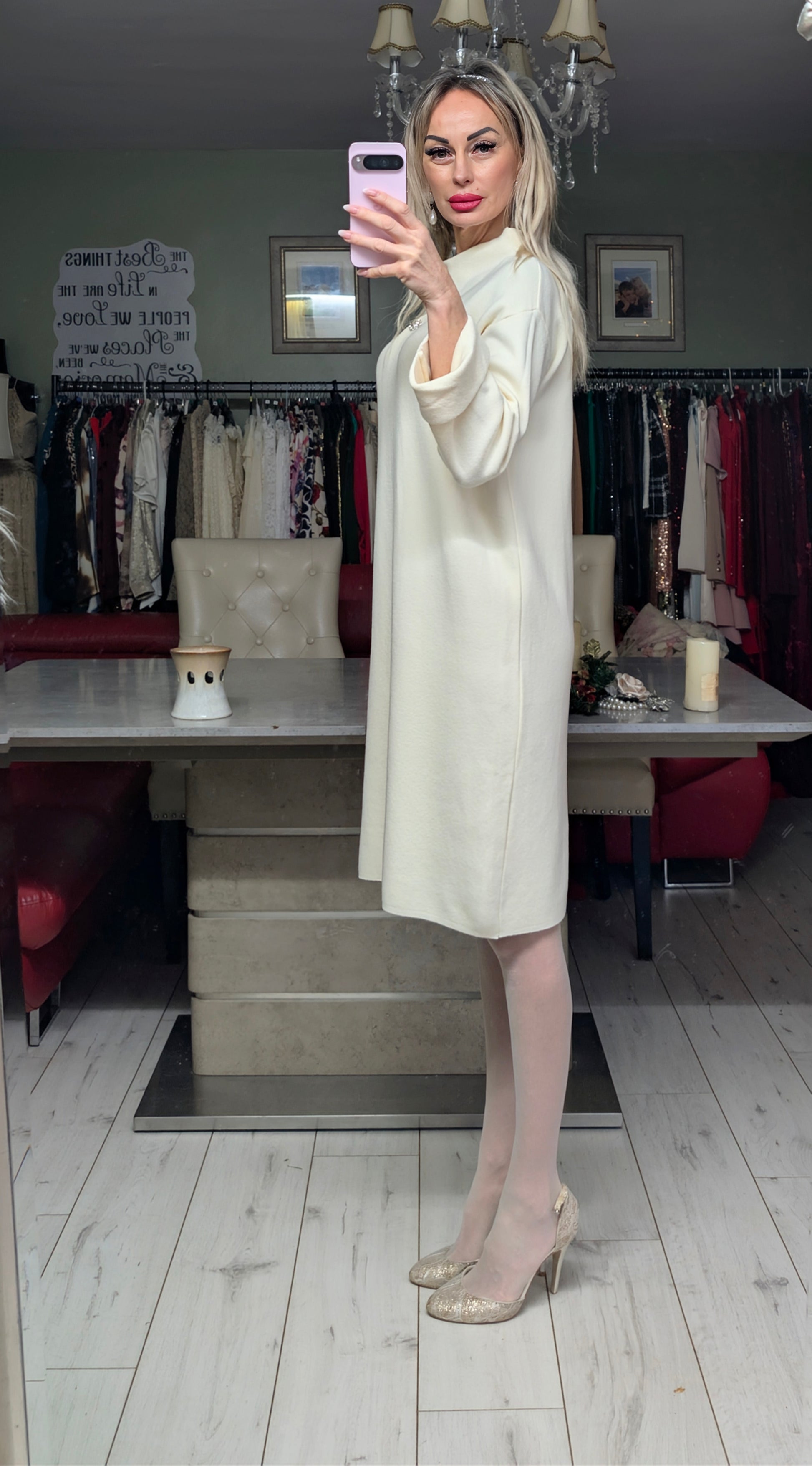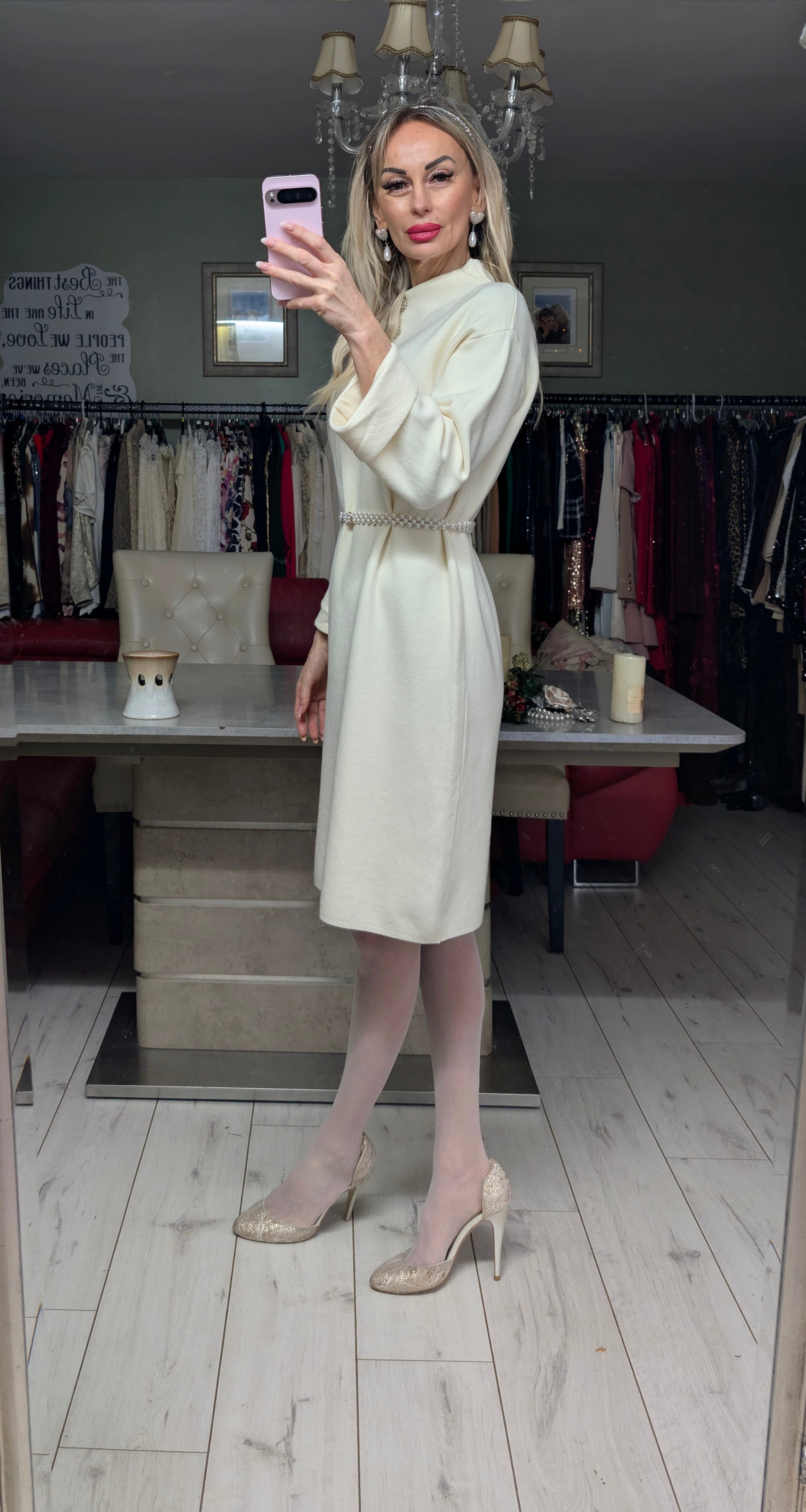 Cream colour midi dress.