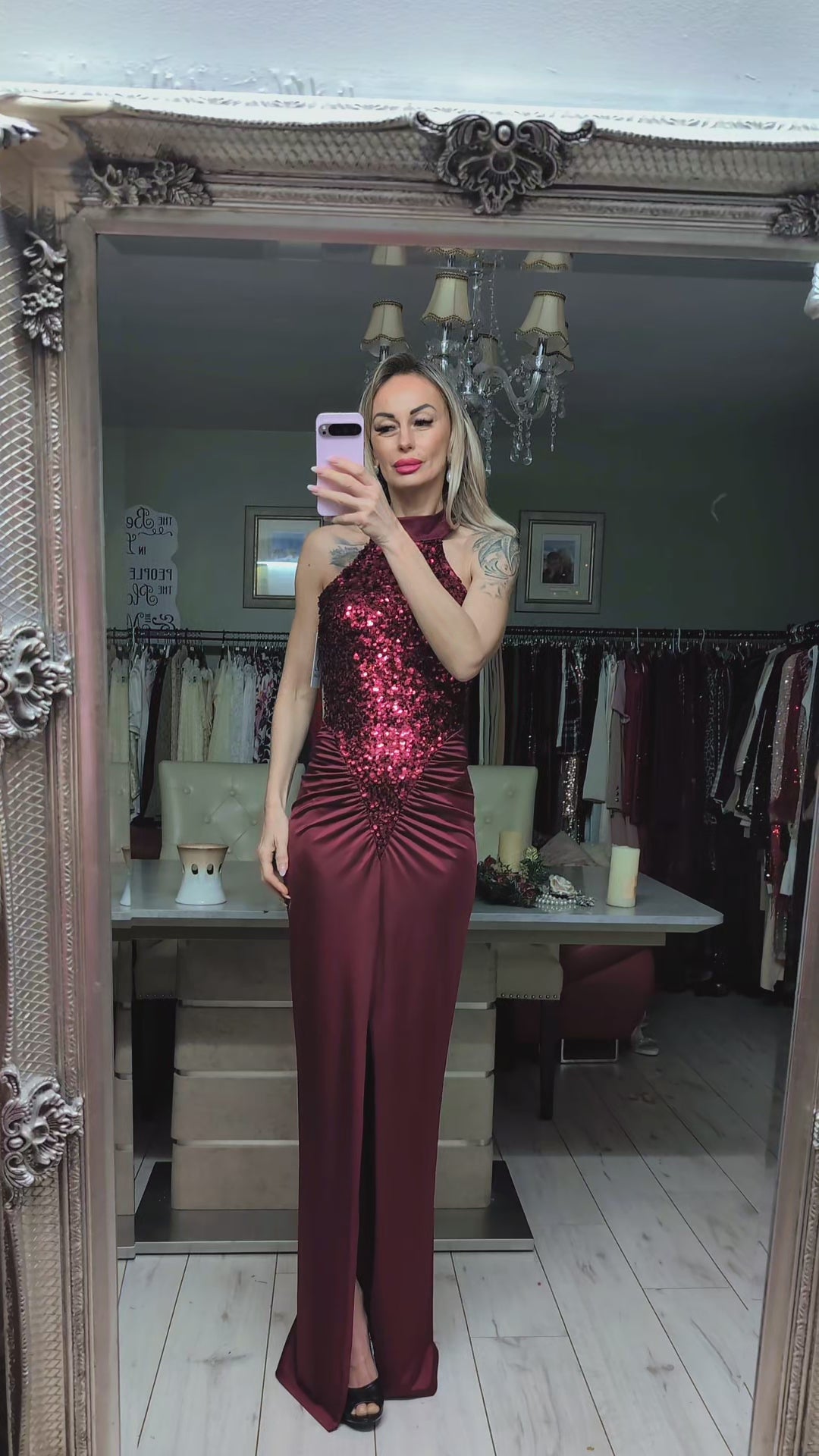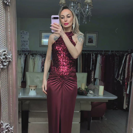 Stunning dress. Burgundy colour. Sequins front top . Split on the front . Size SM